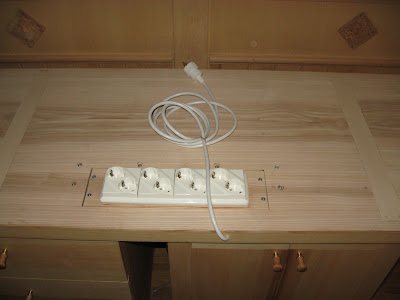 The drawing desk is ready. The customer placed it to same room wheer he has shelves and cabin made by me. The desk measurements (length, width, height) are 1800mm x 500mm x 730mm. The desk consist of 50mm thick cover, three boxes and shelf. The cover is made from separate whole wood upper and lower boards which have enough room for expanding and shrinking. Lower boards has eight electricity sockets mounted on it. The sides of cover have been combined from below with dovetail joints.